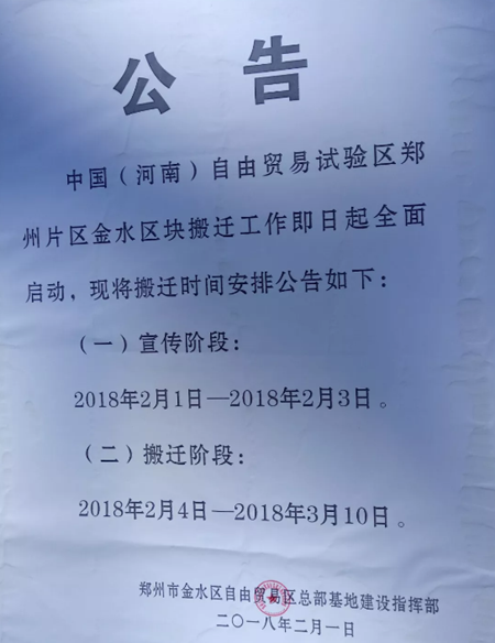 2月8日,按照《国务院关于同意设立中国(河南)商业试验区的批复》、《国务院关于印发中国(河南)商业试验区总体方案的通知》、《河南省人平易近关于印发中国(河南)商业试验区扶植实施方案的通知》,单单天荣汽配城占地面积80万平方米,正在试验区红线内的建建物均列入搬家范畴。街道办答复称“房钱退还工做的从体为市场办理方,里头显示“中国(河南)商业试验区郑州片区金水区块搬家工做全面启动”。