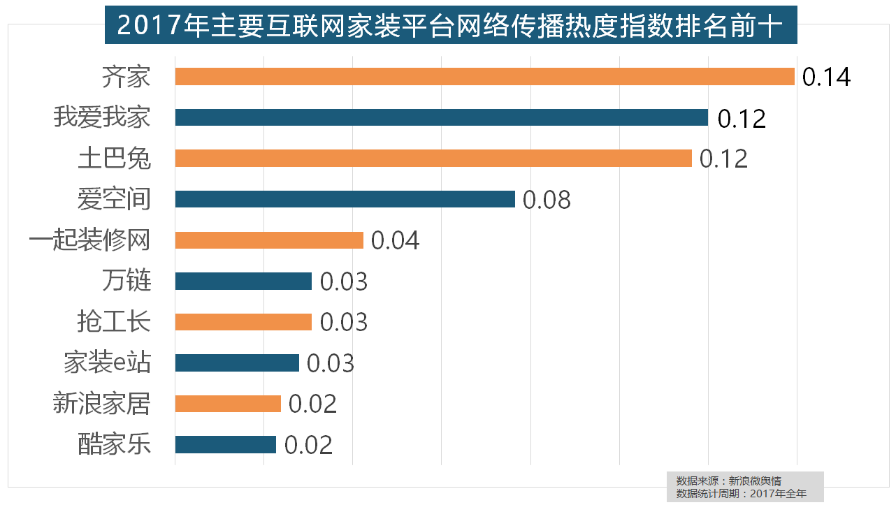 据新浪微舆情对我国次要互联网家拆平台大数据阐发显示,近年来,万链、抢工长、家拆e坐、新浪家居、酷家乐正在年度互联网家拆平台热度榜上排名第六到第十位。收集热度指数遍及低于保守家拆设想龙头企业。2017年?